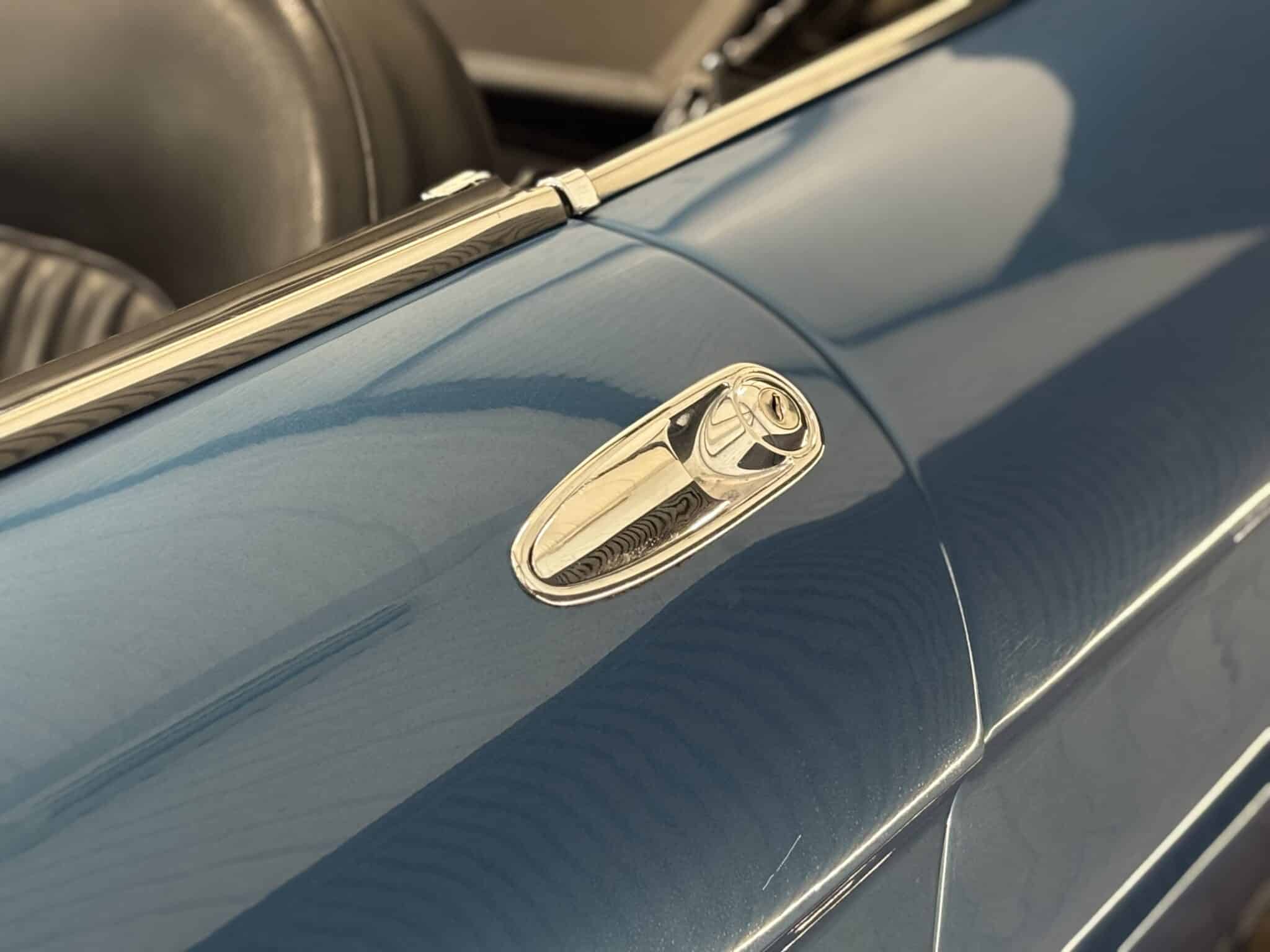 Bilen fremstår i en frisk metallic blå lakering, som står i flot kontrast til den sorte kaleche og matchende sort læderkabine. Den har 5-trins gearkasse, hvilket gør den både letkørt og langbenet – uanset om du nyder en tur ad snoede landeveje eller i byen med kalechen nede.